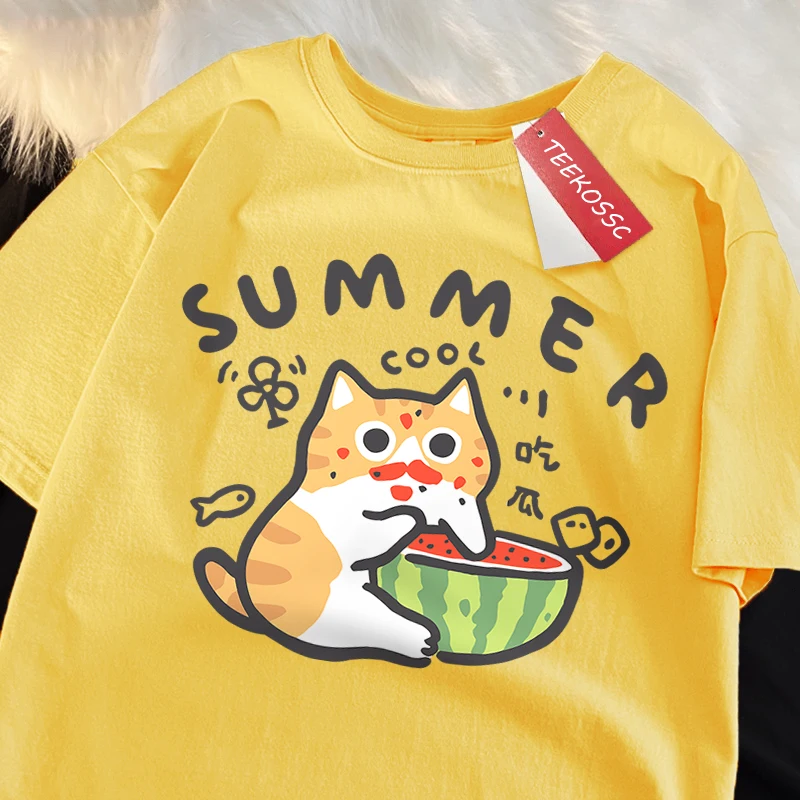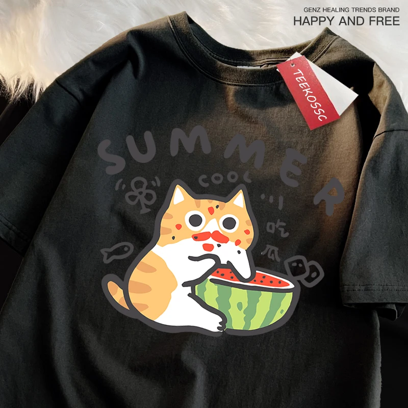 Fun Eating Watermelon Cat Japanese Style T-Shirt Male Fashion Cotton T-Shirts Hip Hop Oversize Tshirt Casual Cotton T-Shirts