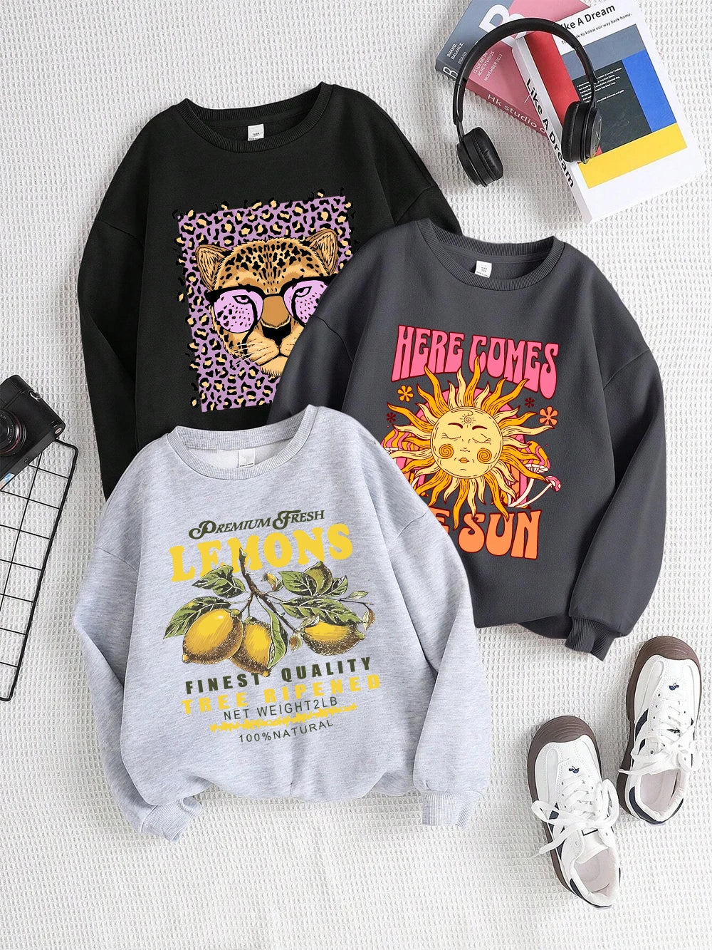 Lemons Leopard And Sun Prints Sweatshirts Winter Women Casual Loose Hoodies Fleece Warm Crewneck Pullover Comfortable Clothes